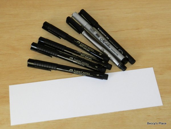 I have lots of different sorts of pens, mostly because I buy them when I come across them. I try to keep a wide selection of nib sizes so that I can create very fine lines right up to very thick, bold lines. Different pen nibs will give you different results, so make sure you have a go with lots of different types of pens. Oh, and you certainly don't need to purchase the most expensive brands... check out what the local newsagent or office supply store carries, you'll be amazed at their range. (If you're a scrapbooker, make sure the pens you are using are acid free.)