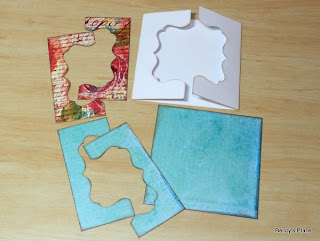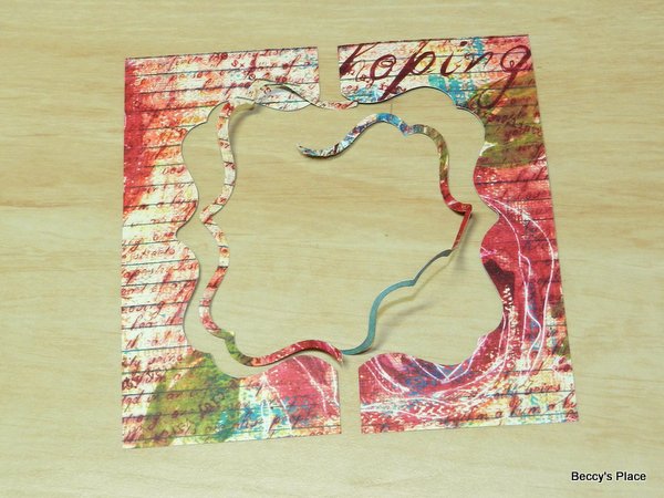 10. Using the same die, cut another window in one of the other pieces of patterned paper. Repeat steps 7 - 9. Now you will have a card blank, four pieces of die cut paper and a 53/4" square of patterned paper. If you would like to ink the edges of your paper and cardstock, now is the time.