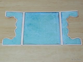 6. Place the card and patterned paper through the die cutting machine. The die will cut through the two side flaps of the card as well as the piece of patterned paper.