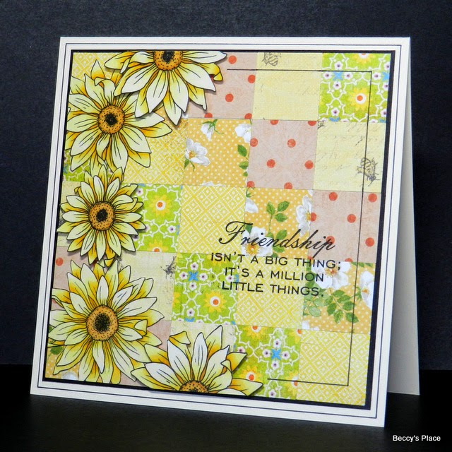 I printed out some old freebies from my blog... I'm not really sure if they're sunflowers or gerberas, but they worked great against my scrappy yellow background. After fussy cutting around them, I used a combination of glue and foam tape to adhere them along the edge of my card.