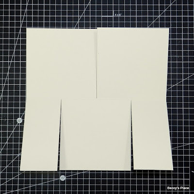 7. To decorate, cut some patterned paper and card stock slightly smaller than the panels. I used the card base as a template then trimmed off 1/8" all round. These "L" shaped pieces help to stabilise the card along the score line.